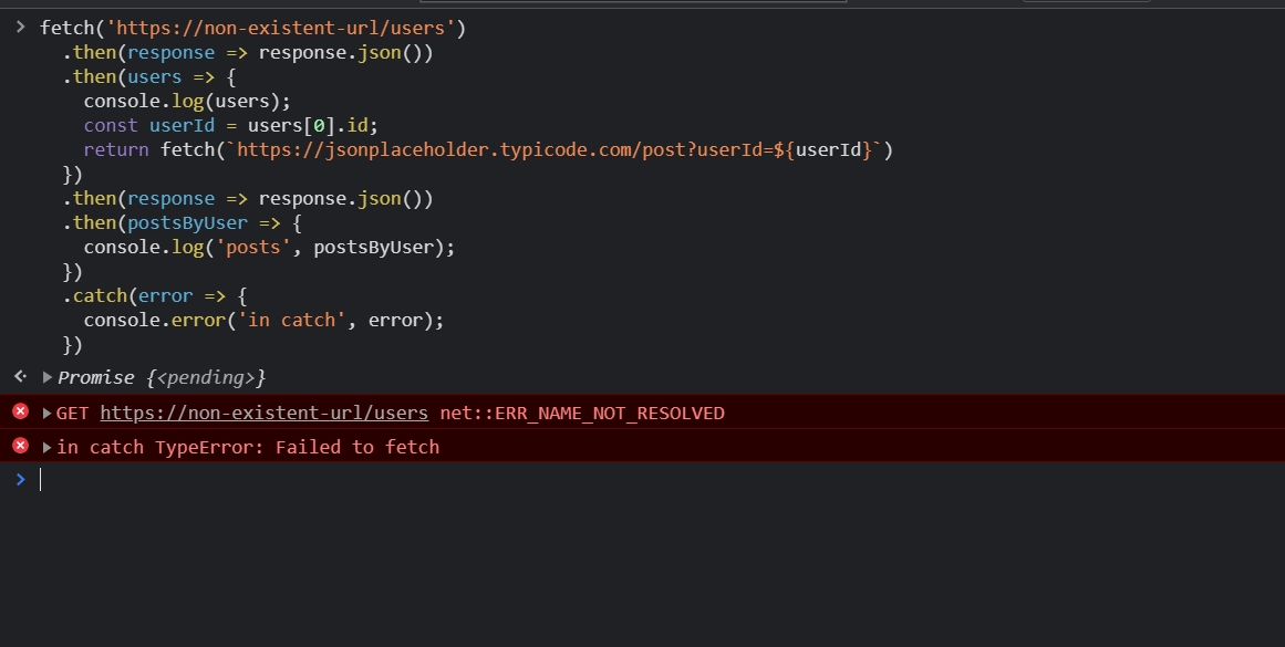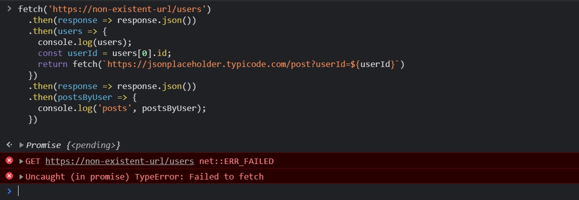 First, let’s produce an error. Replace the URL in our previous promise chain with a non-existent URL. So that the initial fetch itself fails. Execute the code. You will get the following error.
