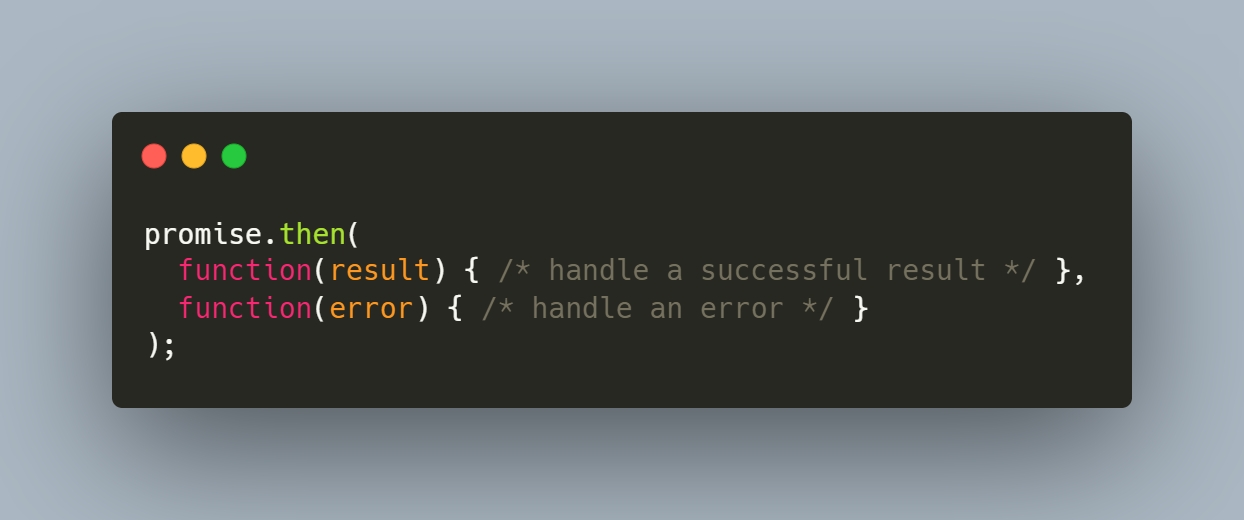 Whether to use a catch block, or handle the error in then block, depends on our requirements and whether the promises are chained together. We will be diving into Promise chaining in the next section. For now, just remember that it is possible to handle the error in then block itself.