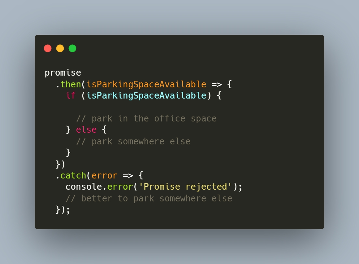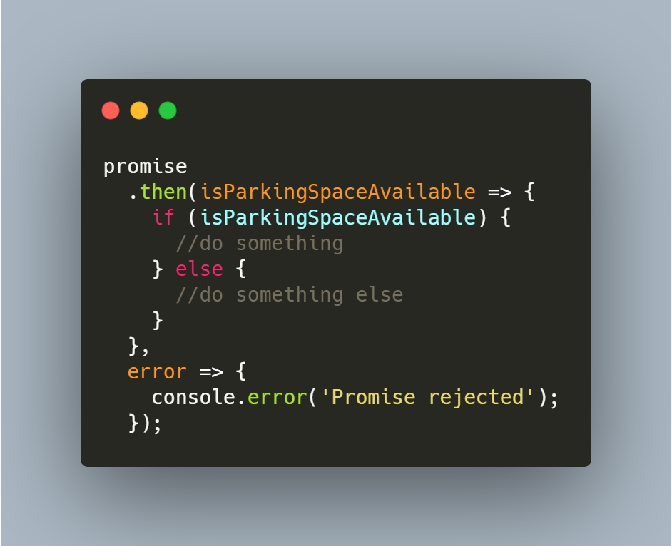 If we could check for the parking spot, promise will be resolved with either true/false. In that case, the first function in then method will be executed.