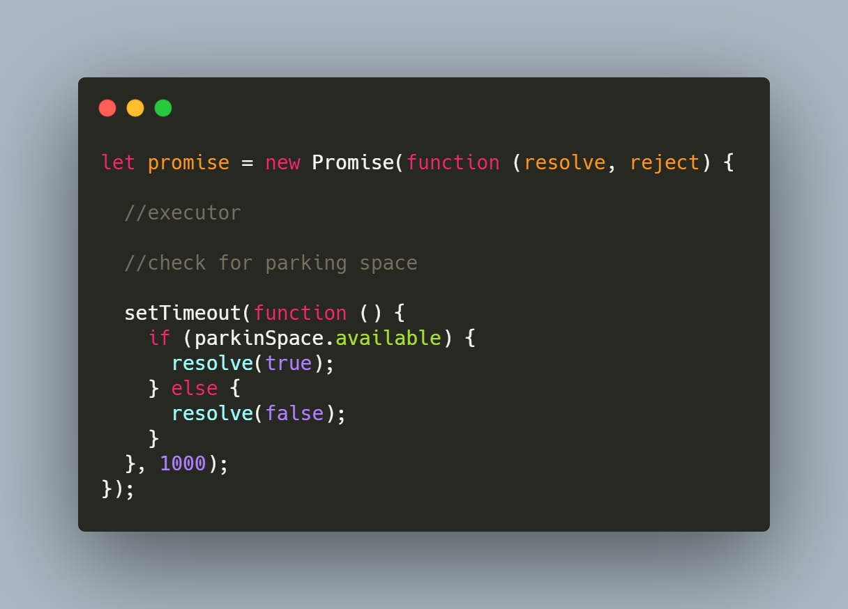 Executor has 2 parameters resolve and reject respectively. They are callbacks and will be executed once our executor function has a result. As per our example: once you understand that whether a spot is available/not.