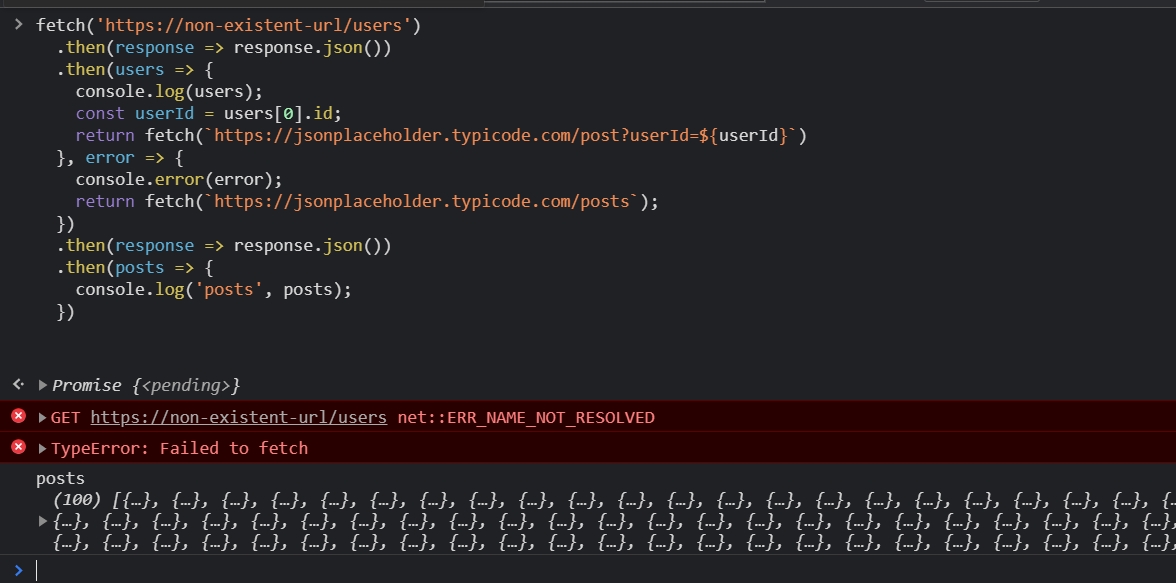 If an error occurs while fetching the users, then instead of fetching the posts by the first user, you want to fetch all the posts in the system. In other words, we want the promise chain to resume from a certain point if an error occurs prior to that. How do you do that?