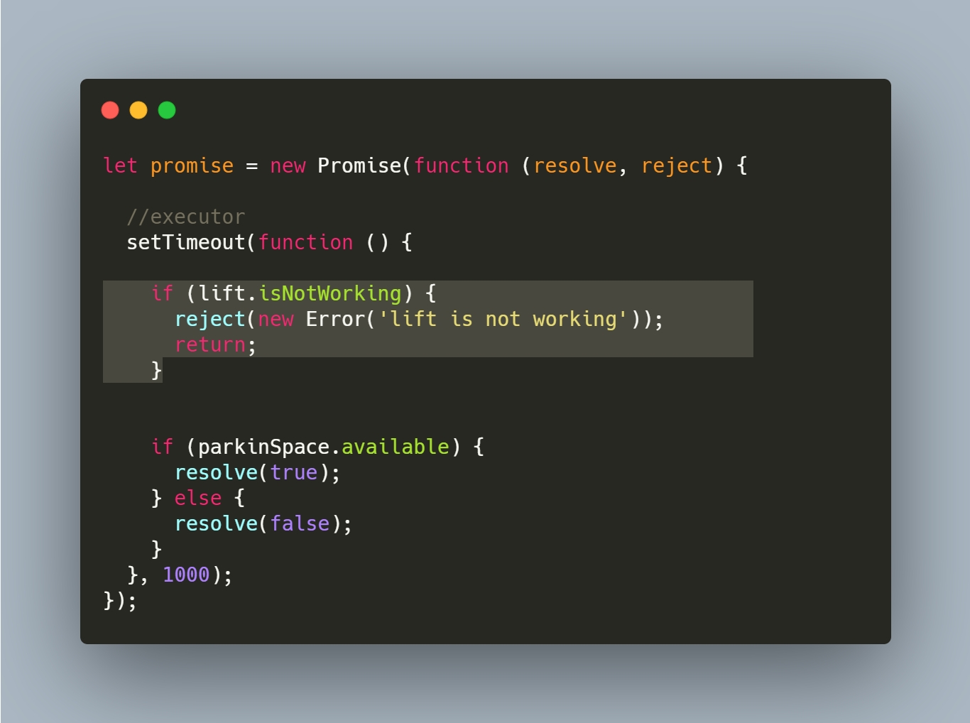 The function passed to the constructor is called executor. When a new Promise is created, the executor runs automatically. It contains the code which should eventually produce the result. In our case, going to the parking lot and checking for an open space.