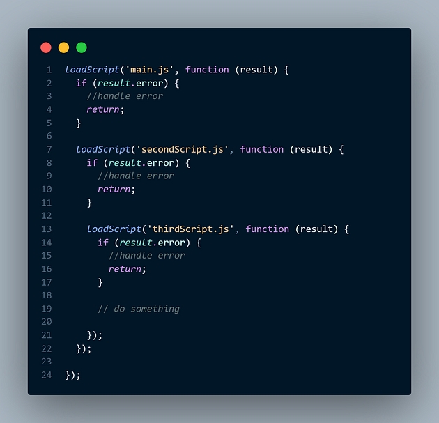 You would feel some unease seeing this. If not, suppose we have to load 10 or 15 files, the functions will be nested and nested and it would resemble what is called a “pyramid of doom”. And the code that is to be executed after all those files will be under all that nested code and it is not only hard to maintain but also very difficult to understand/read the code. This is termed “Callback Hell”.