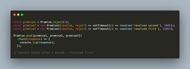 When you execute the above code, you will get the output ‘resolved first’ after 1 second (the first resolved promise), even though the first input promise rejects immediately.