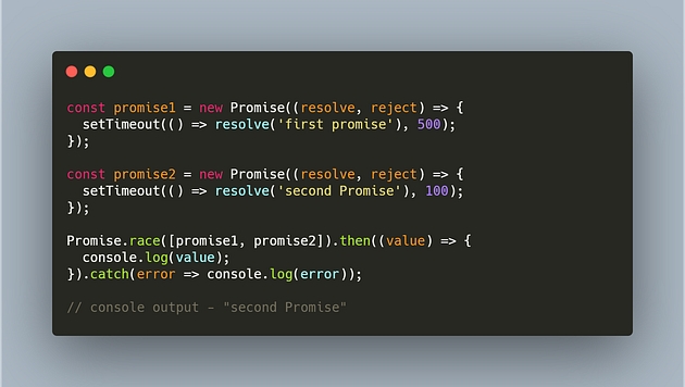 As you can understand from the example, the output will be — second Promise, since it resolves faster than the first promise.