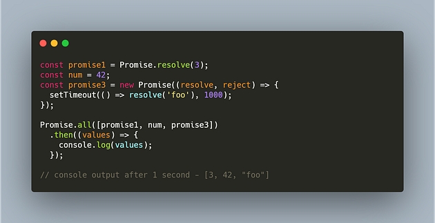 In the above example, we have 3 variables passed into the Promise.all method.