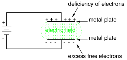 When a voltage is applied across the two plates of a capacitor, a concentrated field flux is created between them, allowing a significant difference of free electrons (a charge) to develop between the two plates: