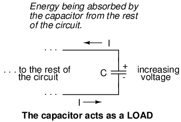 When the voltage across a capacitor is increased, it draws current from the rest of the circuit, acting as a power load. In this condition the capacitor is said to be charging, because there is an increasing amount of energy being stored in its electric field. Note the direction of electron current with regard to the voltage polarity: