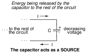 Conversely, when the voltage across a capacitor is decreased, the capacitor supplies current to the rest of the circuit, acting as a power source. In this condition the capacitor is said to be discharging. Its store of energy -- held in the electric field -- is decreasing now as energy is released to the rest of the circuit. Note the direction of electron current with regard to the voltage polarity: