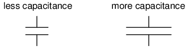 PLATE SPACING: All other factors being equal, further plate spacing gives less capacitance; closer plate spacing gives greater capacitance.