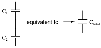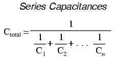 Thus, the total capacitance is less than any one of the individual capacitors' capacitances. The formula for calculating the series total capacitance is the same form as for calculating parallel resistances: