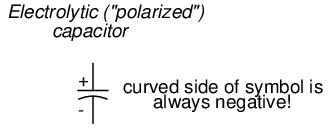 Polarity: Some capacitors are manufactured so they can only tolerate applied voltage in one polarity but not the other. This is due to their construction: the dielectric is a microscopically thin layer of insulation deposited on one of the plates by a DC voltage during manufacture. These are called electrolytic capacitors, and their polarity is clearly marked.