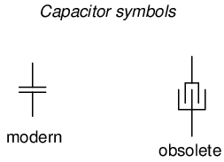 The schematic symbol for a capacitor is quite simple, being little more than two short, parallel lines (representing the plates) separated by a gap. Wires attach to the respective plates for connection to other components. An older, obsolete schematic symbol for capacitors showed interleaved plates, which is actually a more accurate way of representing the real construction of most capacitors: