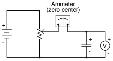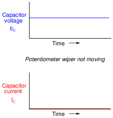 If the potentiometer mechanism remains in a single position (wiper is stationary), the voltmeter connected across the capacitor will register a constant (unchanging) voltage, and the ammeter will register 0 amps. In this scenario, the instantaneous rate of voltage change (dv/dt) is equal to zero, because the voltage is unchanging. The equation tells us that with 0 volts per second change for a dv/dt, there must be zero instantaneous current (i). From a physical perspective, with no change in voltage, there is no need for any electron motion to add or subtract charge from the capacitor's plates, and thus there will be no current.