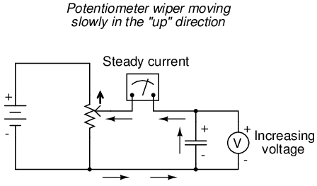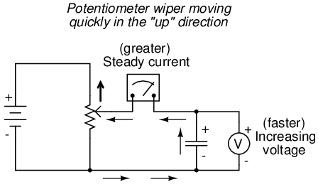 Now, if the potentiometer wiper is moved slowly and steadily in the "up" direction, a greater voltage will gradually be imposed across the capacitor. Thus, the voltmeter indication will be increasing at a slow rate: