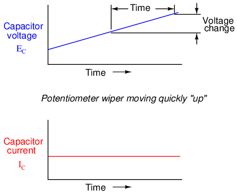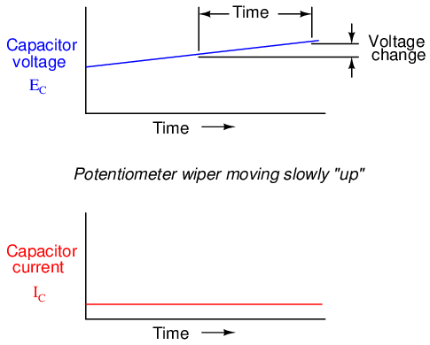 Note how that at any given point in time, the capacitor's current is proportional to the rate-of-change, or slope of the capacitor's voltage plot. When the voltage plot line is rising quickly (steep slope), the current will likewise be great. Where the voltage plot has a mild slope, the current is small. At one place in the voltage plot where it levels off (zero slope, representing a period of time when the potentiometer wasn't moving), the current falls to zero.