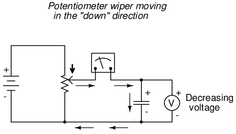 If we were to move the potentiometer wiper in the "down" direction, the capacitor voltage would decrease rather than increase. Again, the capacitor will react to this change of voltage by producing a current, but this time the current will be in the opposite direction. A decreasing capacitor voltage requires that the charge differential between the capacitor's plates be reduced, and the only way that can happen is if the electrons reverse their direction of flow, the capacitor discharging rather than charging. In this condition, with electrons exiting the negative plate and entering the positive, the capacitor will act as a source, like a battery, releasing its stored energy to the rest of the circuit.