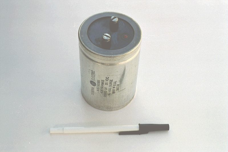 The thinner dielectric layer gives it a much greater capacitance (20,000 µF) and a drastically reduced working voltage (35 volts continuous, 45 volts intermittent).