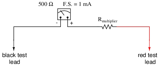 The series resistor is called a "multiplier" resistor because it multiplies the working range of the meter movement as it proportionately divides the measured voltage across it. Determining the required multiplier resistance value is an easy task if you're familiar with series circuit analysis.