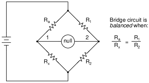 No text on electrical metering could be called complete without a section on bridge circuits. These ingenious circuits make use of a null-balance meter to compare two voltages, just like the laboratory balance scale compares two weights and indicates when they're equal. Unlike the "potentiometer" circuit used to simply measure an unknown voltage, bridge circuits can be used to measure all kinds of electrical values, not the least of which being resistance.
