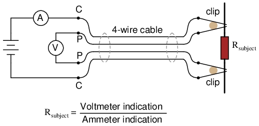 This method of measurement which avoids errors caused by wire resistance is called the Kelvin, or 4-wire method. Special connecting clips called Kelvin clips are made to facilitate this kind of connection across a subject resistance:
