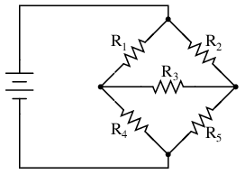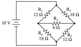 A prime application for Δ-Y conversion is in the solution of unbalanced bridge circuits, such as the one below: