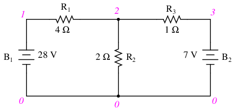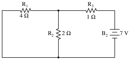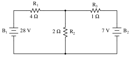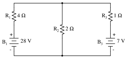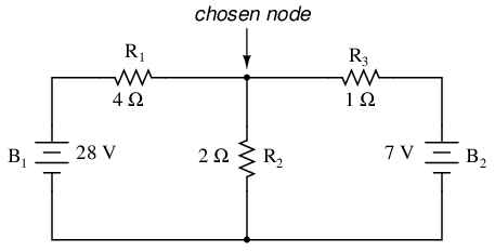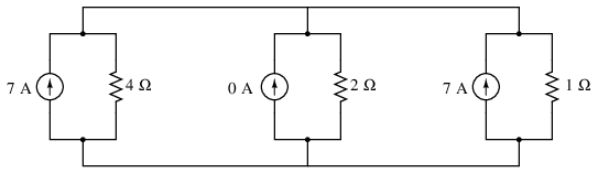 Thus, in the circuit above, battery B1 and resistor R1 are seen as a Thevenin source to be converted into a Norton source of 7 amps (28 volts / 4 Ω) in parallel with a 4 Ω resistor. The rightmost branch will be converted into a 7 amp current source (7 volts / 1 Ω) and 1 Ω resistor in parallel. The center branch, containing no voltage source at all, will be converted into a Norton source of 0 amps in parallel with a 2 Ω resistor: