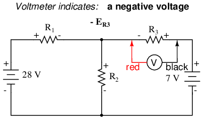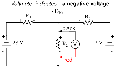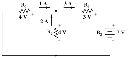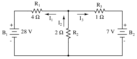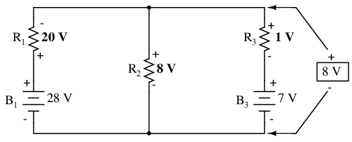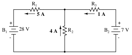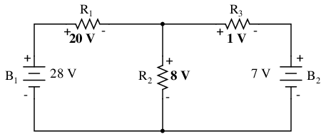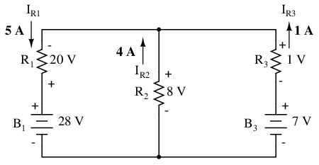Notice how current is being pushed backwards through battery 2 (electrons flowing “up”) due to the higher voltage of battery 1 (whose current is pointed “down” as it normally would)! Despite the fact that battery B2's polarity is trying to push electrons down in that branch of the circuit, electrons are being forced backwards through it due to the superior voltage of battery B1. Does this mean that the stronger battery will always “win” and the weaker battery always get current forced through it backwards? No! It actually depends on both the batteries' relative voltages and the resistor values in the circuit. The only sure way to determine what's going on is to take the time to mathematically analyze the network.