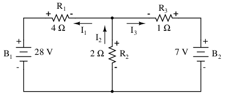 The choice of each current's direction is entirely arbitrary, just as in the Branch Current method, but the resulting equations are easier to solve if the currents are going the same direction through intersecting components (note how currents I1 and I2 are both going “up” through resistor R2, where they “mesh,” or intersect). If the assumed direction of a mesh current is wrong, the answer for that current will have a negative value.