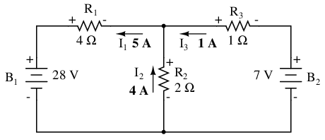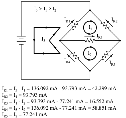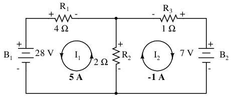 Mesh current I1 is going “up” through R2, while mesh current I2 is going “down” through R2. To determine the actual current through R2, we must see how mesh currents I1 and I2 interact (in this case they're in opposition), and algebraically add them to arrive at a final value. Since I1 is going “up” at 5 amps, and I2 is going “down” at 1 amp, the real current through R2 must be a value of 4 amps, going “up:”