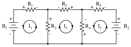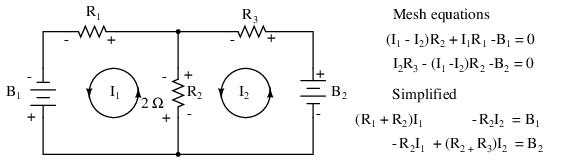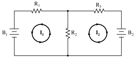 The first step in the Mesh Current method is to identify “loops” within the circuit encompassing all components. In our example circuit, the loop formed by B1, R1, and R2 will be the first while the loop formed by B2, R2, and R3 will be the second. The strangest part of the Mesh Current method is envisioning circulating currents in each of the loops. In fact, this method gets its name from the idea of these currents meshing together between loops like sets of spinning gears: