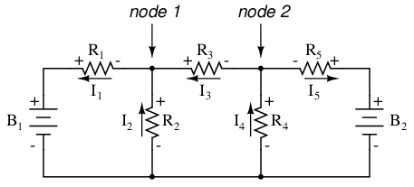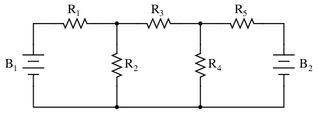 Resistors R2 and R3 are no longer in parallel with each other, because B2 has been inserted into R3's branch of the circuit. Upon closer inspection, it appears there are no two resistors in this circuit directly in series or parallel with each other. This is the crux of our problem: in series-parallel analysis, we started off by identifying sets of resistors that were directly in series or parallel with each other, reducing them to single equivalent resistances. If there are no resistors in a simple series or parallel configuration with each other, then what can we do?