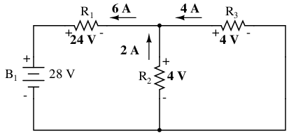 This change of current direction from what was first assumed will alter the polarity of the voltage drops across R2 and R3 due to current I2. From here, we can say that the current through R1 is 5 amps, with the voltage drop across R1 being the product of current and resistance (E=IR), 20 volts (positive on the left and negative on the right). Also, we can safely say that the current through R3 is 1 amp, with a voltage drop of 1 volt (E=IR), positive on the left and negative on the right. But what is happening at R2?