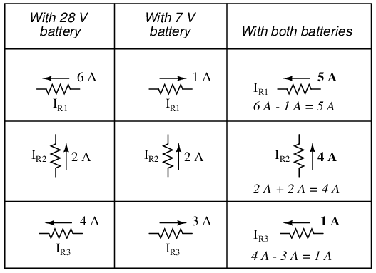 To negate all but one power source for analysis, replace any source of voltage (batteries) with a wire; replace any current source with an open (break).