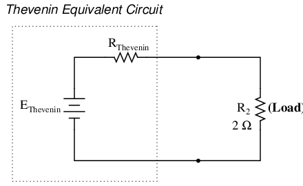 With the load resistor (2 Ω) attached between the connection points, we can determine voltage across it and current through it as though the whole network were nothing more than a simple series circuit: