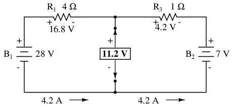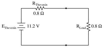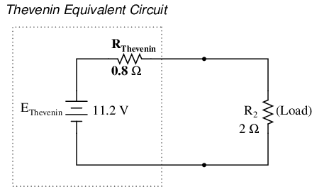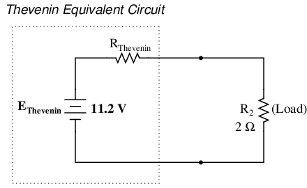 The voltage between the two load connection points can be figured from the one of the battery's voltage and one of the resistor's voltage drops, and comes out to 11.2 volts. This is our “Thevenin voltage” (EThevenin) in the equivalent circuit: