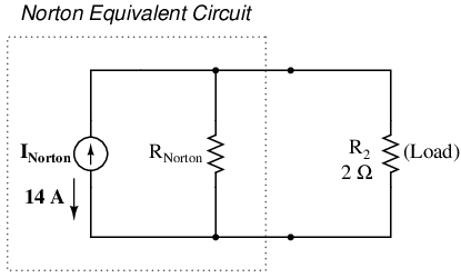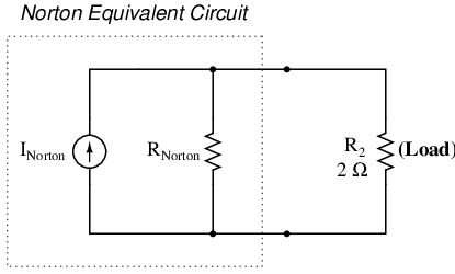 As with the Thevenin equivalent circuit, the only useful information from this analysis is the voltage and current values for R2; the rest of the information is irrelevant to the original circuit. However, the same advantages seen with Thevenin's Theorem apply to Norton's as well: if we wish to analyze load resistor voltage and current over several different values of load resistance, we can use the Norton equivalent circuit again and again, applying nothing more complex than simple parallel circuit analysis to determine what's happening with each trial load.
