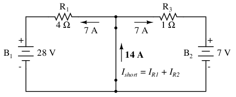 With zero voltage dropped between the load resistor connection points, the current through R1 is strictly a function of B1's voltage and R1's resistance: 7 amps (I=E/R). Likewise, the current through R3 is now strictly a function of B2's voltage and R3's resistance: 7 amps (I=E/R). The total current through the short between the load connection points is the sum of these two currents: 7 amps + 7 amps = 14 amps. This figure of 14 amps becomes the Norton source current (INorton) in our equivalent circuit: