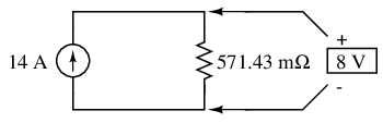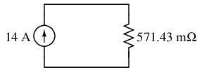In this case, the resistance total will be equal to 571.43 milliohms (571.43 mΩ). We can re-draw our equivalent circuit now as one with a single Norton current source and Norton resistance: