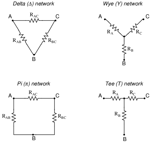 In many circuit applications, we encounter components connected together in one of two ways to form a three-terminal network: the “Delta,” or Δ (also known as the “Pi,” or π) configuration, and the “Y” (also known as the “T”) configuration.