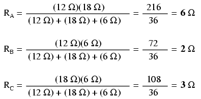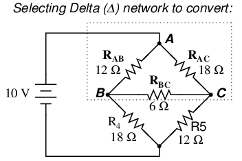 Δ and Y networks can be converted to their equivalent counterparts with the proper resistance equations. By “equivalent,” I mean that the two networks will be electrically identical as measured from the three terminals (A, B, and C).