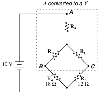 If we perform our calculations correctly, the voltages between points A, B, and C will be the same in the converted circuit as in the original circuit, and we can transfer those values back to the original bridge configuration.