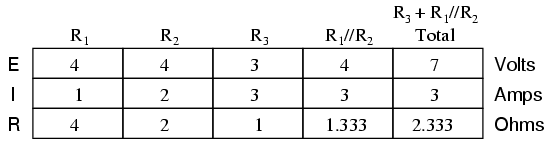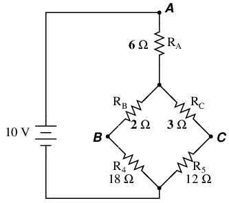 With the two-battery circuit, there is no way to arrive at a value for “total resistance,” because there are two sources of power to provide voltage and current (we would need two “total” resistances in order to proceed with any Ohm's Law calculations). With the unbalanced bridge circuit, there is such a thing as total resistance across the one battery (paving the way for a calculation of total current), but that total current immediately splits up into unknown proportions at each end of the bridge, so no further Ohm's Law calculations for voltage (E=IR) can be carried out.