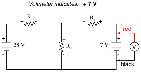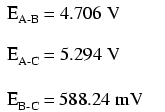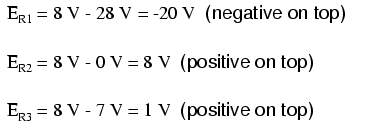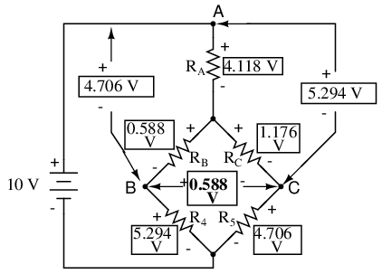 We must use the voltage drops figures from the table above to determine the voltages between points A, B, and C, seeing how the add up (or subtract, as is the case with voltage between points B and C):