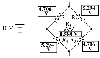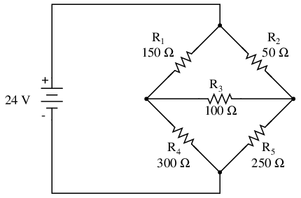Since the ratios of R1/R4 and R2/R5 are unequal, we know that there will be voltage across resistor R3, and some amount of current through it. As discussed at the beginning of this chapter, this type of circuit is irreducible by normal series-parallel analysis, and may only be analyzed by some other method.