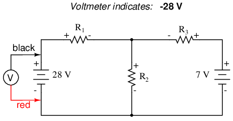 Sure enough, the voltage figures all turn out to be the same: 20 volts across R1 (nodes 1 and 2), 8 volts across R2 (nodes 2 and 0), and 1 volt across R3 (nodes 2 and 3). Take note of the signs of all these voltage figures: they're all positive values! SPICE bases its polarities on the order in which nodes are listed, the first node being positive and the second node negative. For example, a figure of positive (+) 20 volts between nodes 1 and 2 means that node 1 is positive with respect to node 2. If the figure had come out negative in the SPICE analysis, we would have known that our actual polarity was “backwards” (node 1 negative with respect to node 2). Checking the node orders in the SPICE listing, we can see that the polarities all match what we determined through the Branch Current method of analysis.