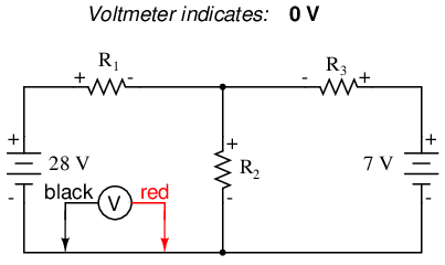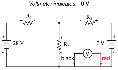 Having completed our trace of the left loop, we add these voltage indications together for a sum of zero: