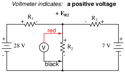 A current of 4 amps through R2's resistance of 2 Ω gives us a voltage drop of 8 volts (E=IR), positive on the top and negative on the bottom.