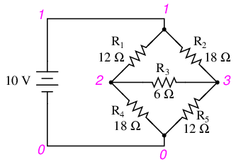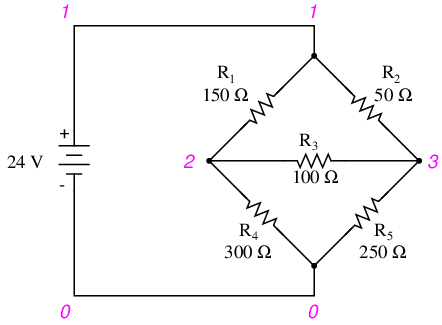 Let us now analyze this network using SPICE to verify our voltage figures.[spi] We could analyze current as well with SPICE, but since that requires the insertion of extra components into the circuit, and because we know that if the voltages are all the same and all the resistances are the same, the currents must all be the same, I'll opt for the less complex analysis. Here's a re-drawing of our circuit, complete with node numbers for SPICE to reference: