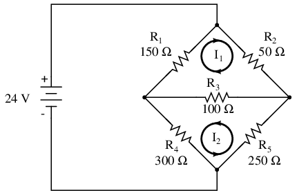The Mesh Current Method, also known as the Loop Current Method, is quite similar to the Branch Current method in that it uses simultaneous equations, Kirchhoff's Voltage Law, and Ohm's Law to determine unknown currents in a network. It differs from the Branch Current method in that it does not use Kirchhoff's Current Law, and it is usually able to solve a circuit with less unknown variables and less simultaneous equations, which is especially nice if you're forced to solve without a calculator.